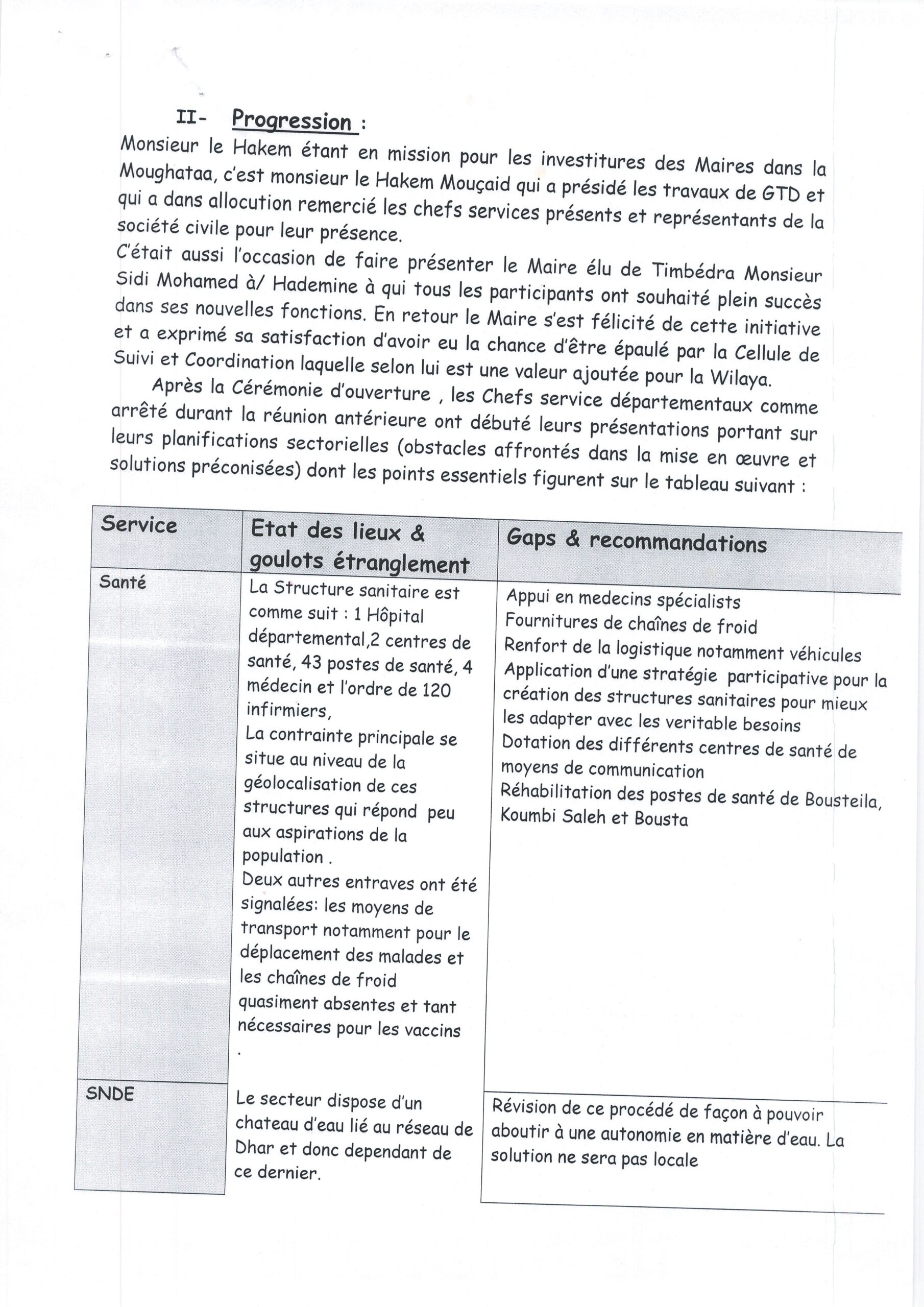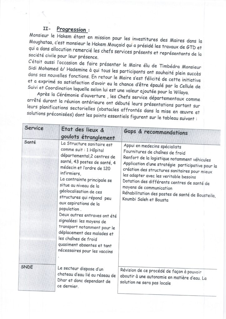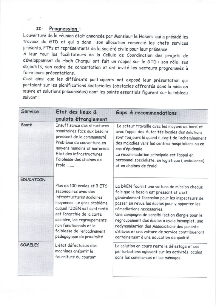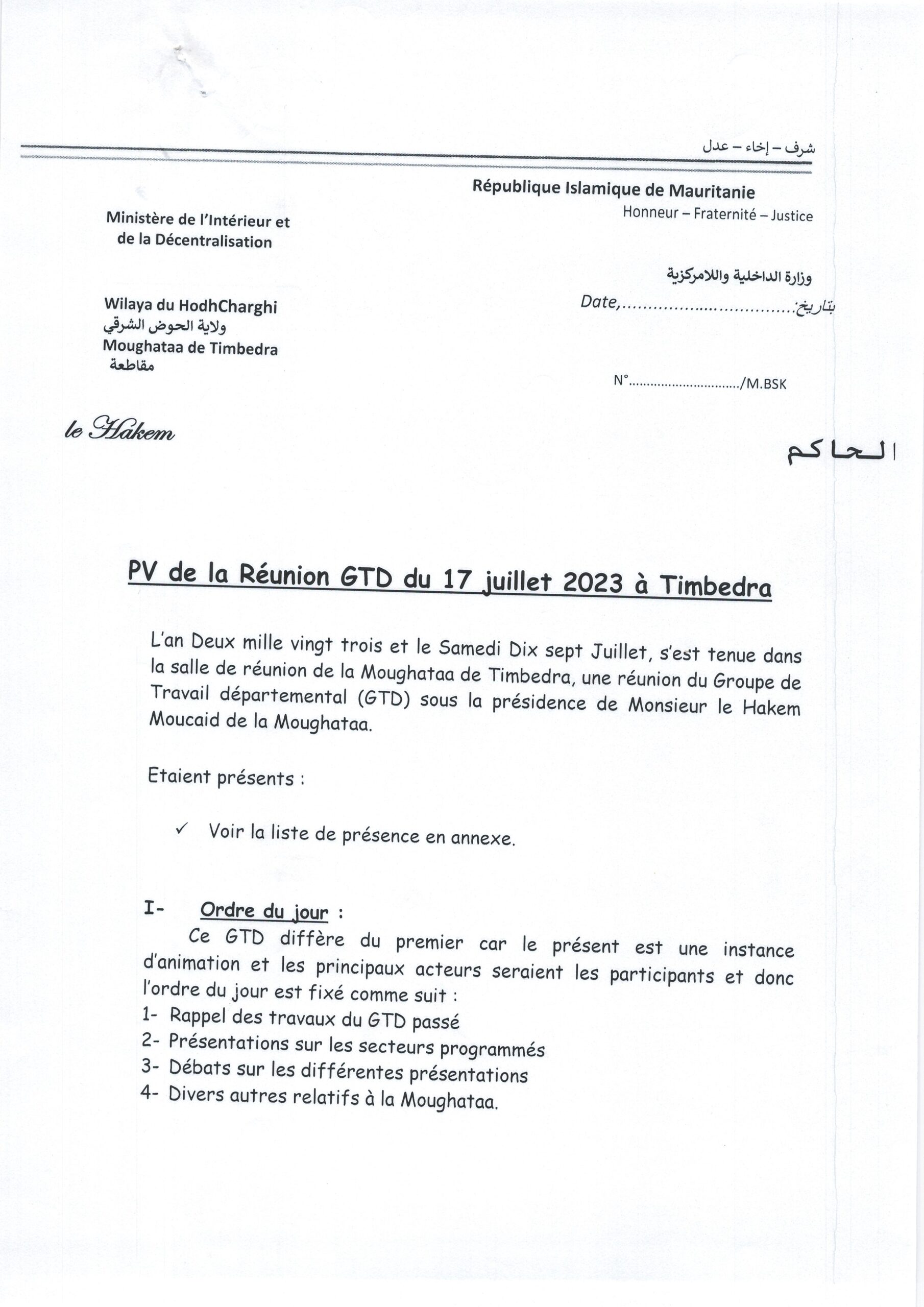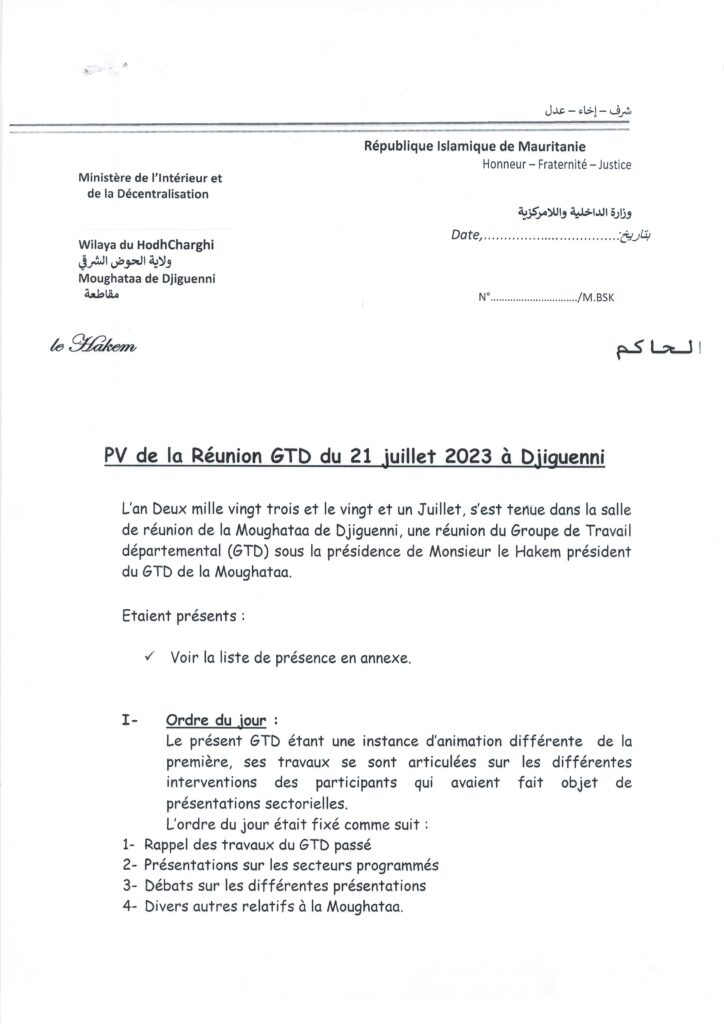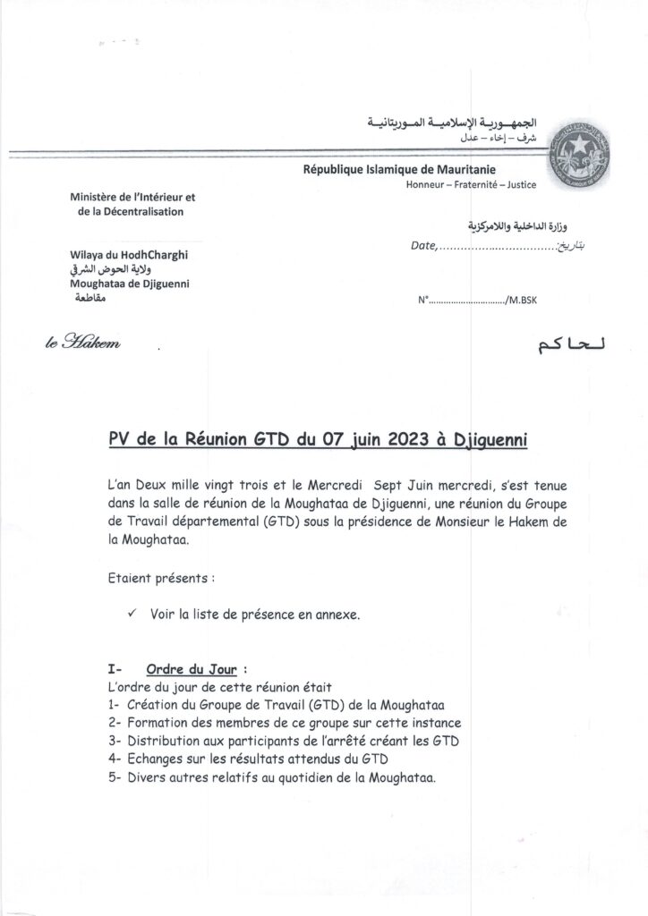 PV des réunions de Groupe de travail Départemental GTD , Groupe de Travail Régional GTR et Groupe de Travail Sectoriel GTS qui se sont tenus dans les différentes Moughataas de la Wilaya du Hodh Charqui.